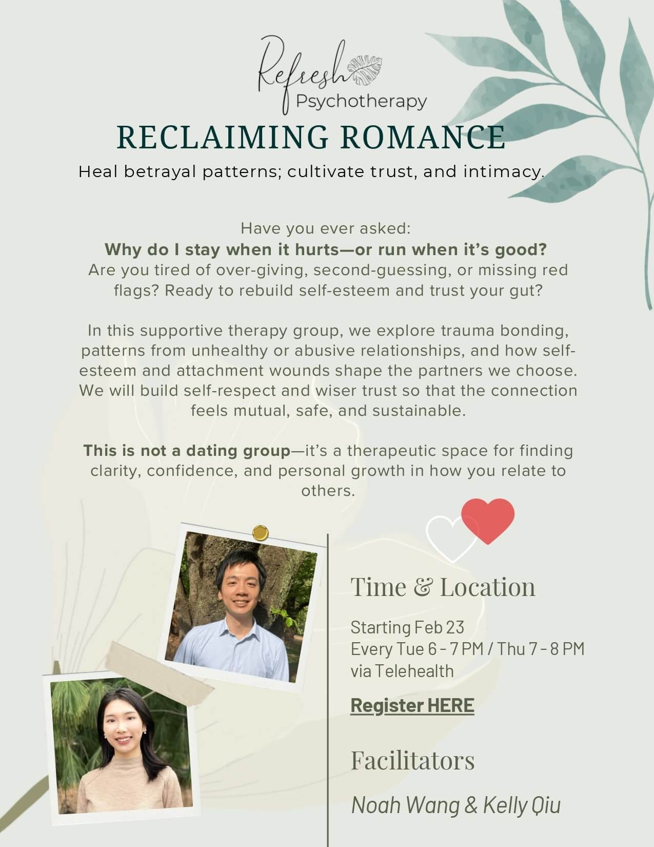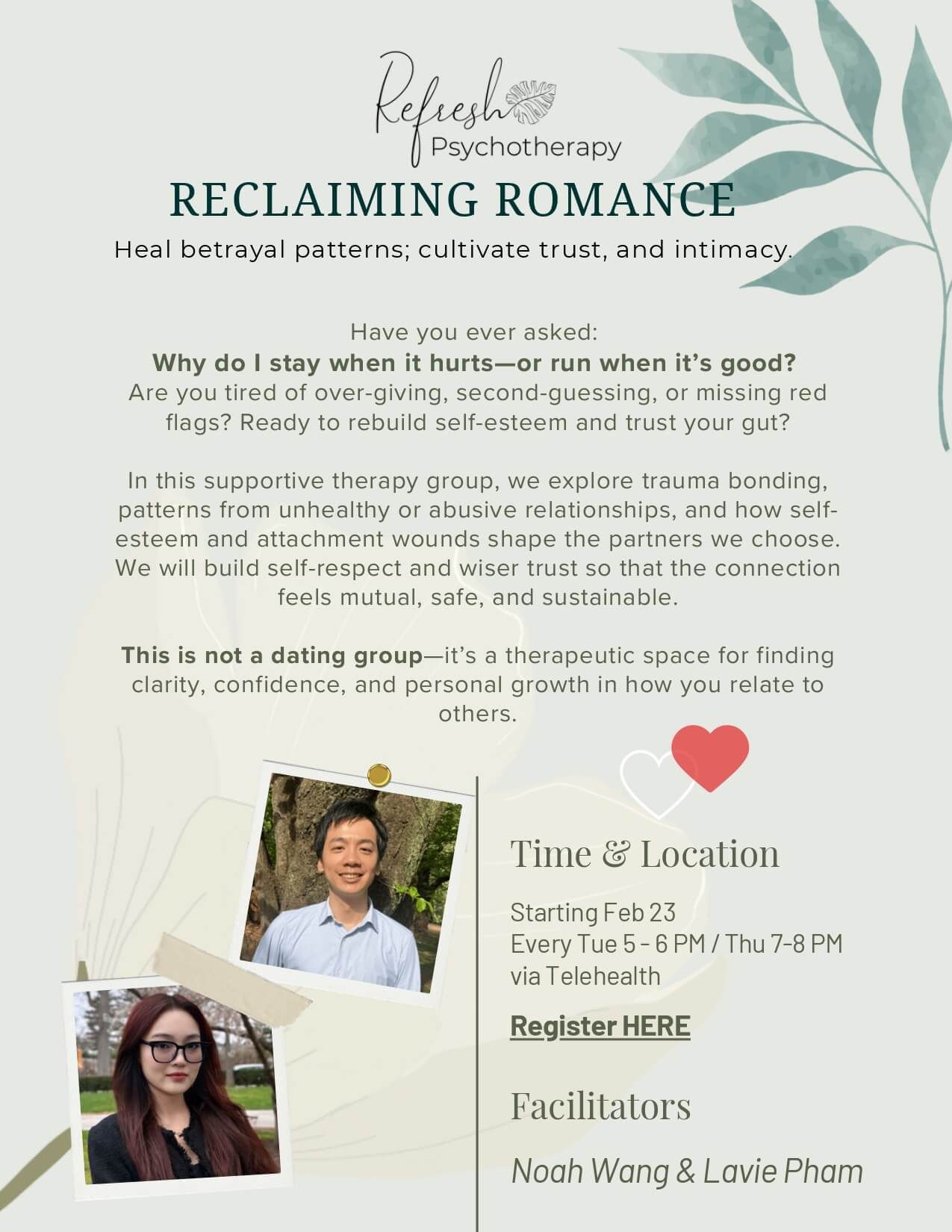 Group therapy is an important part of the psychotherapeutic journey. Groups are a space to build a sense of community and be challenged and held accountable by others with a similar experience. Groups provide a confidential space to discuss concerns, fears, and struggles openly. We have found that attending groups in conjunction with individual therapy sessions can help accelerate the healing and self-reflection processes.